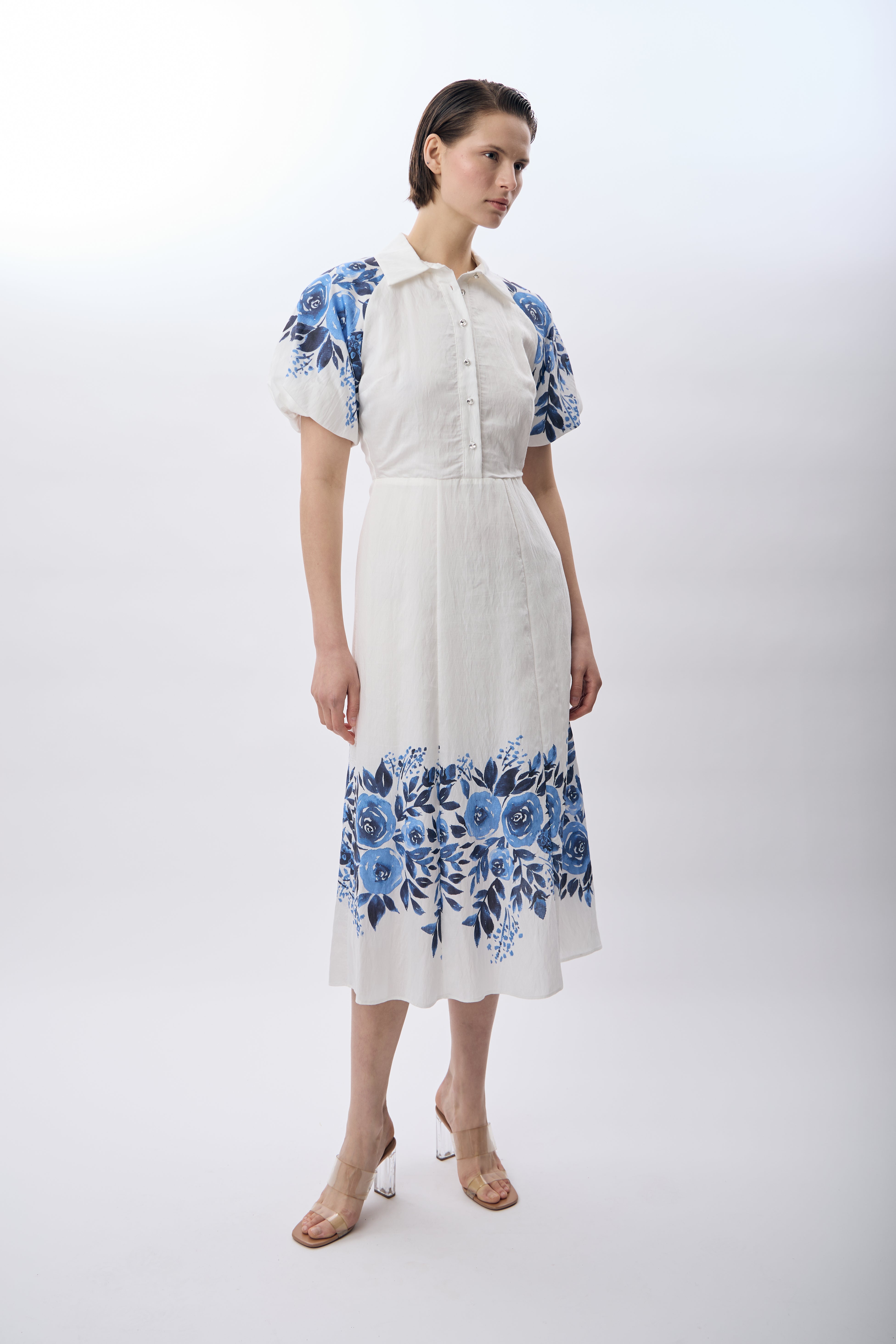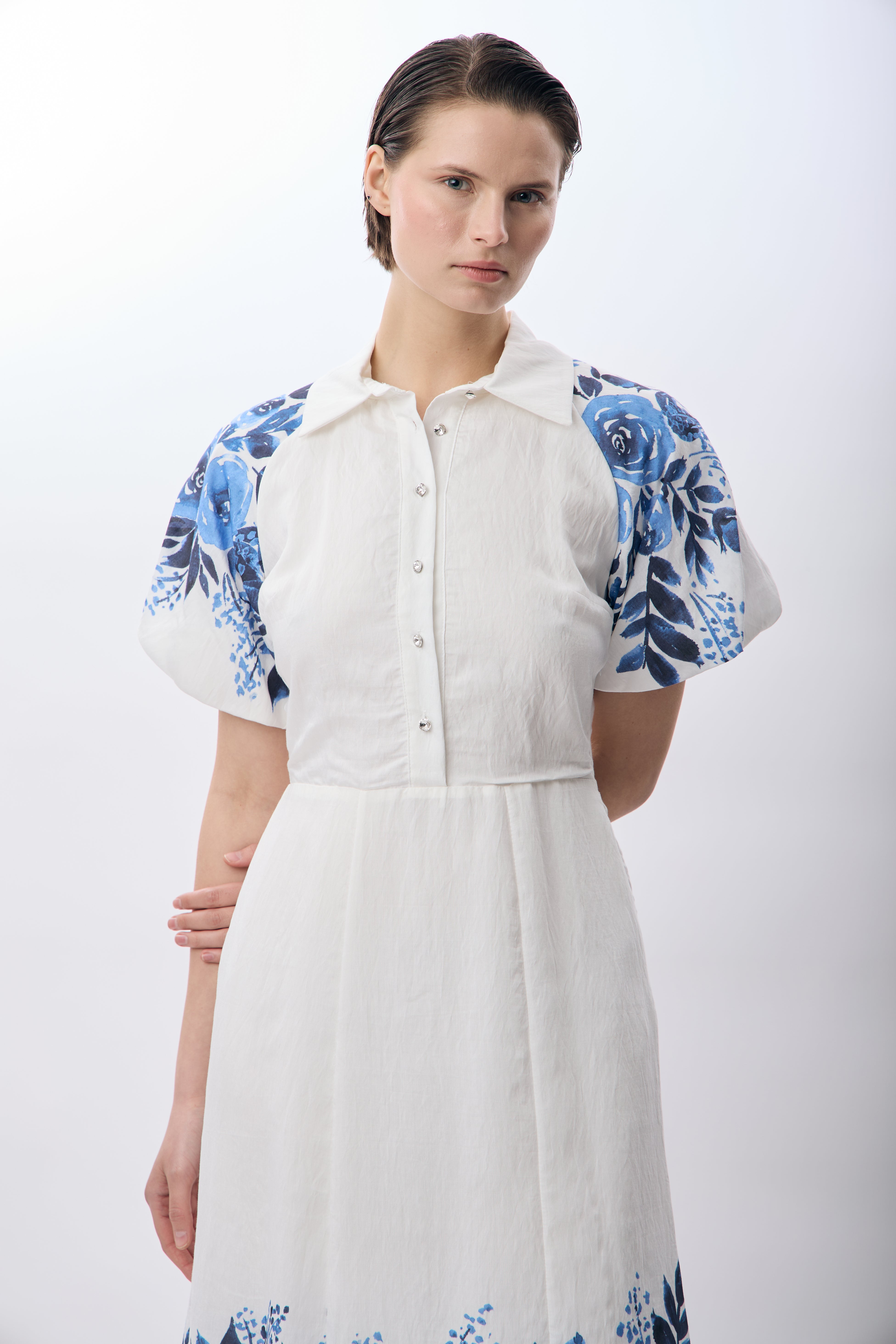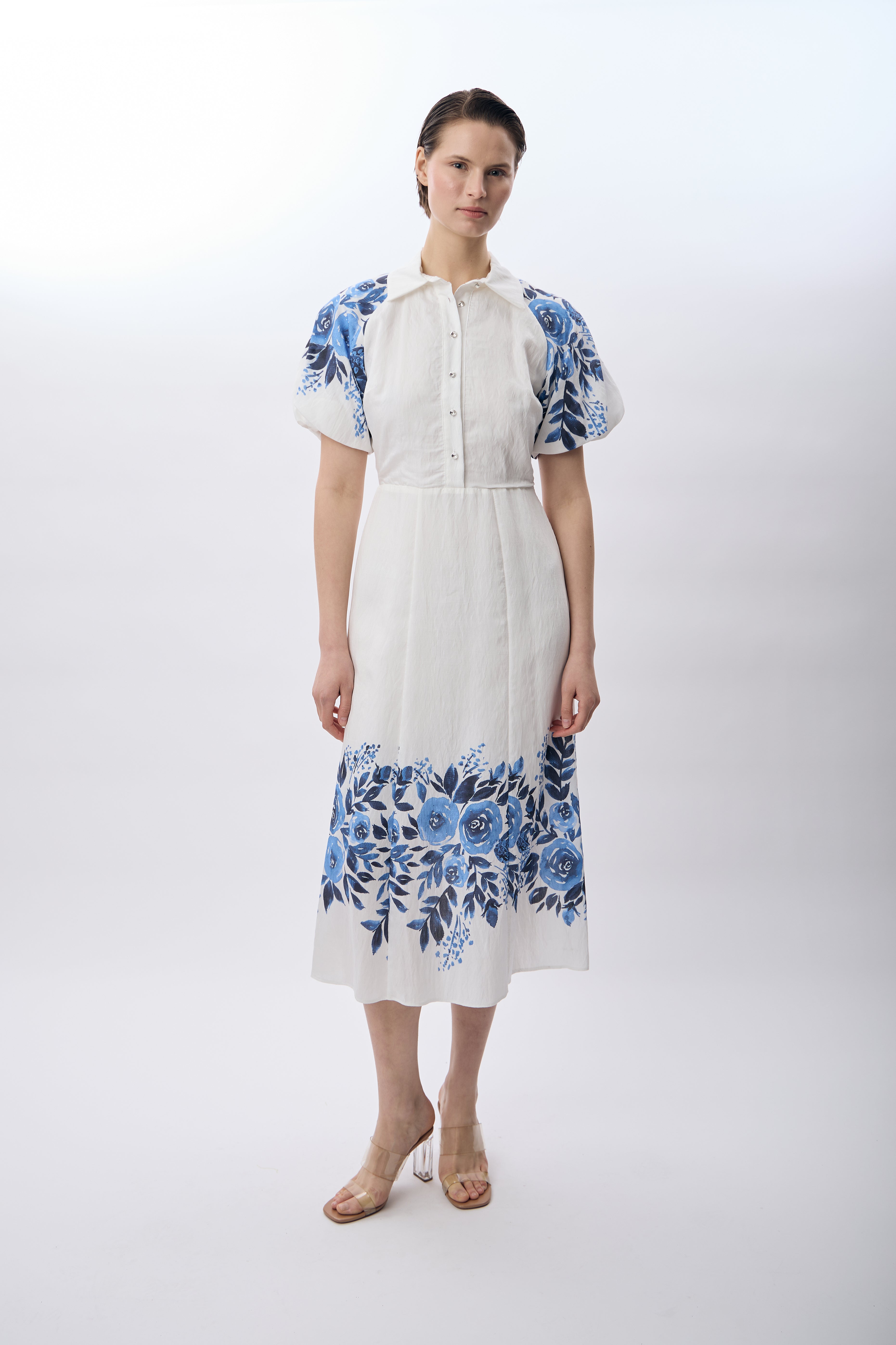 Balon Kollu Desenli Maksi Elbise (Ekru)