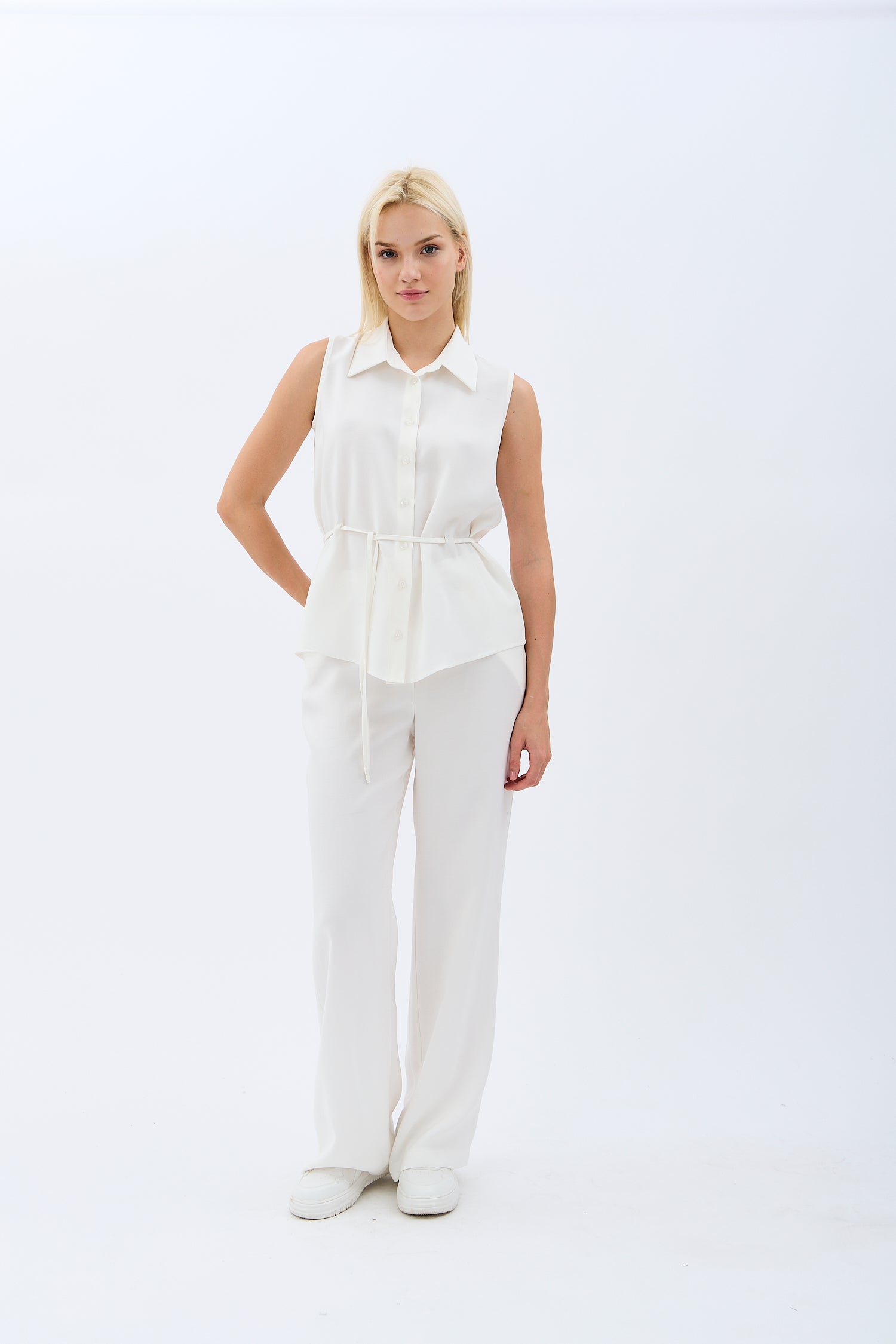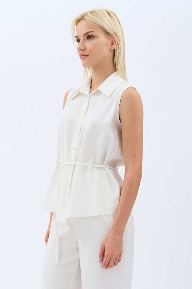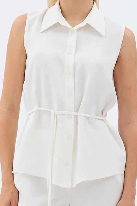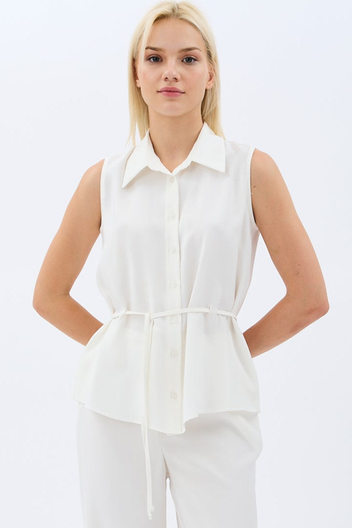 Bel Bağcıklı Kolsuz Gömlek Yaka Bluz (Ekru)