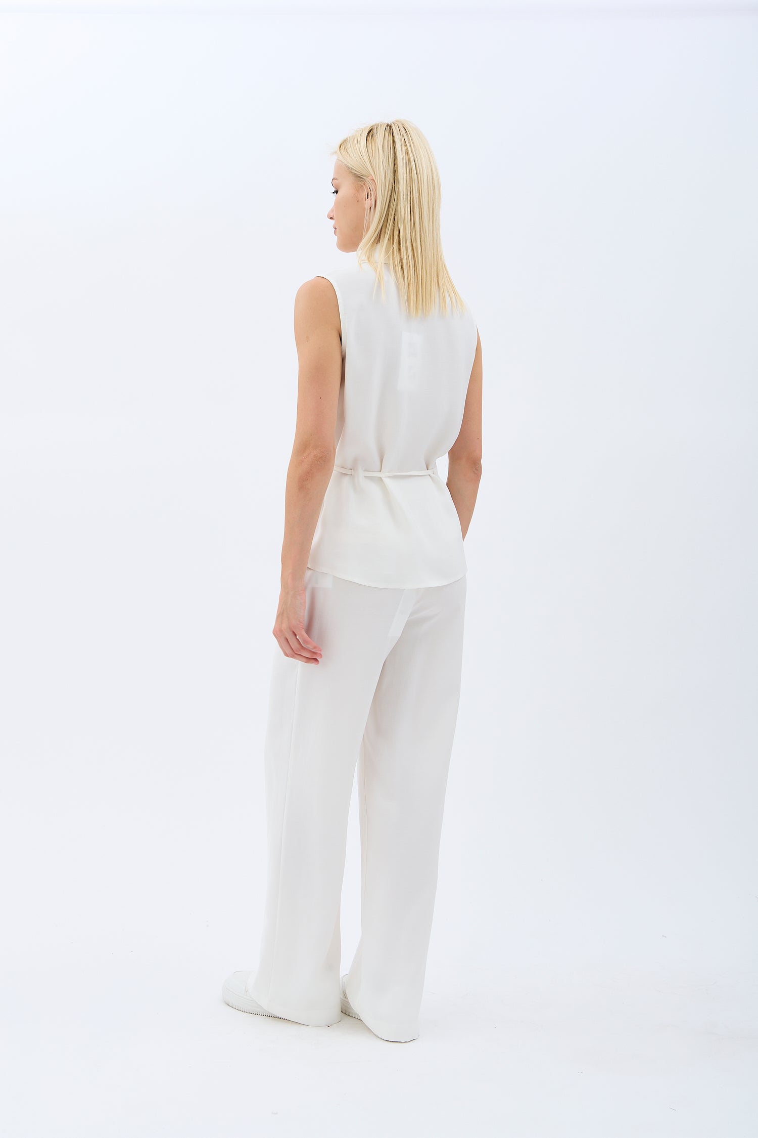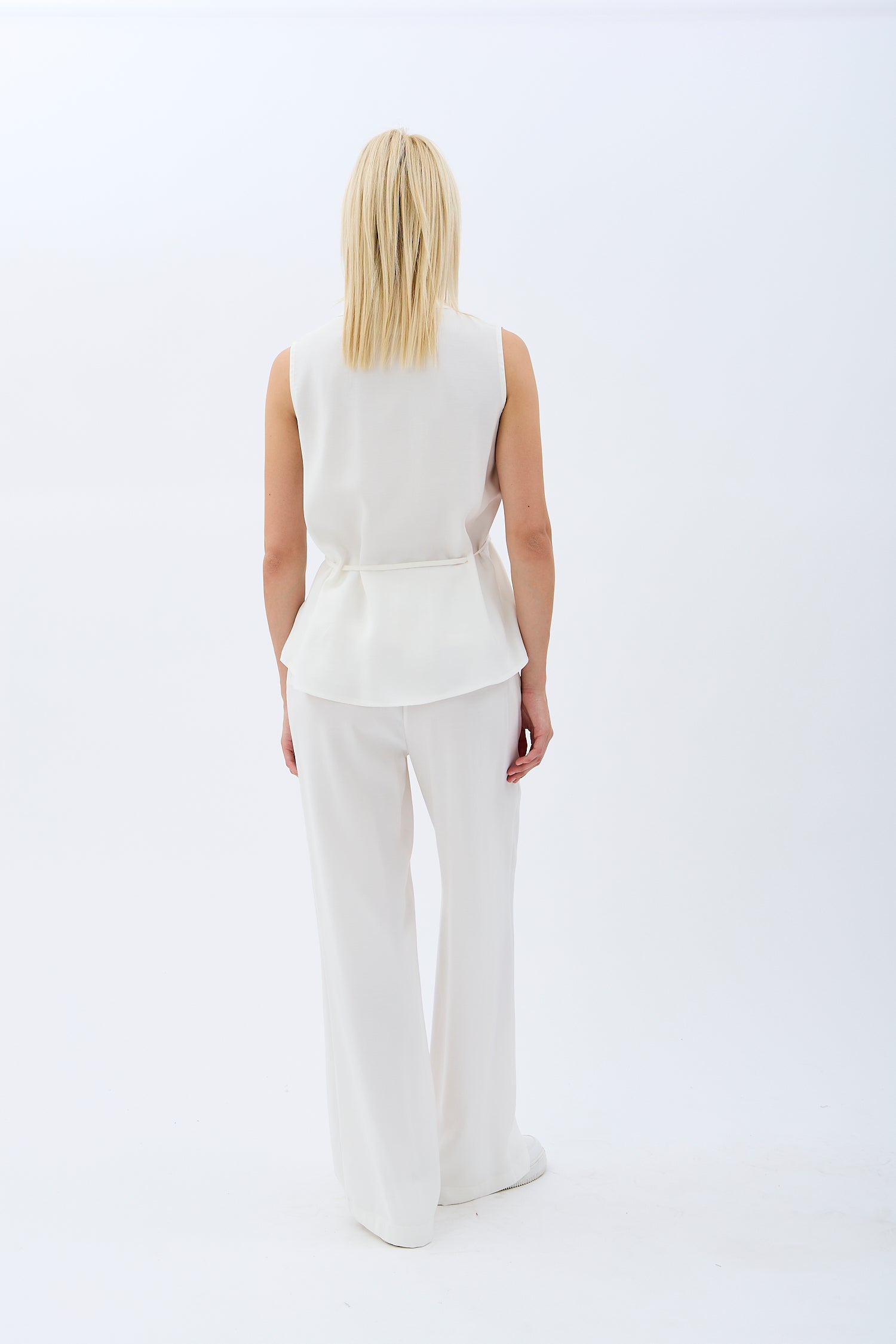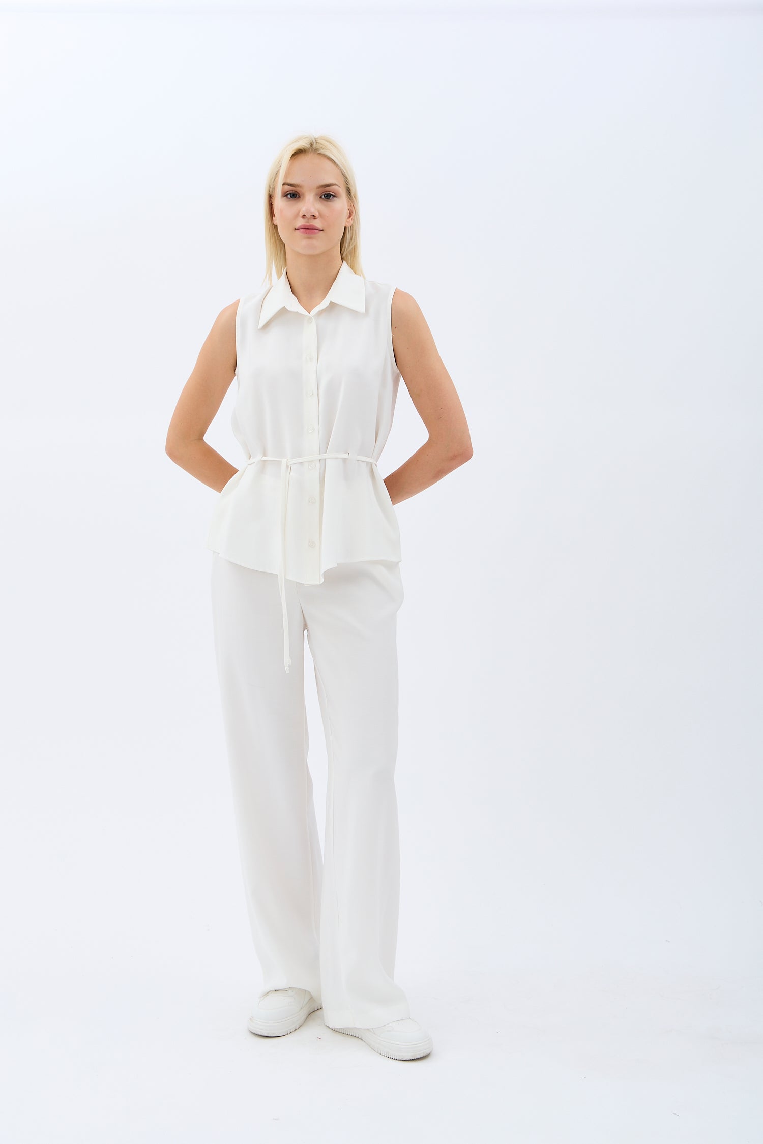 Bel Bağcıklı Kolsuz Gömlek Yaka Bluz (Ekru)