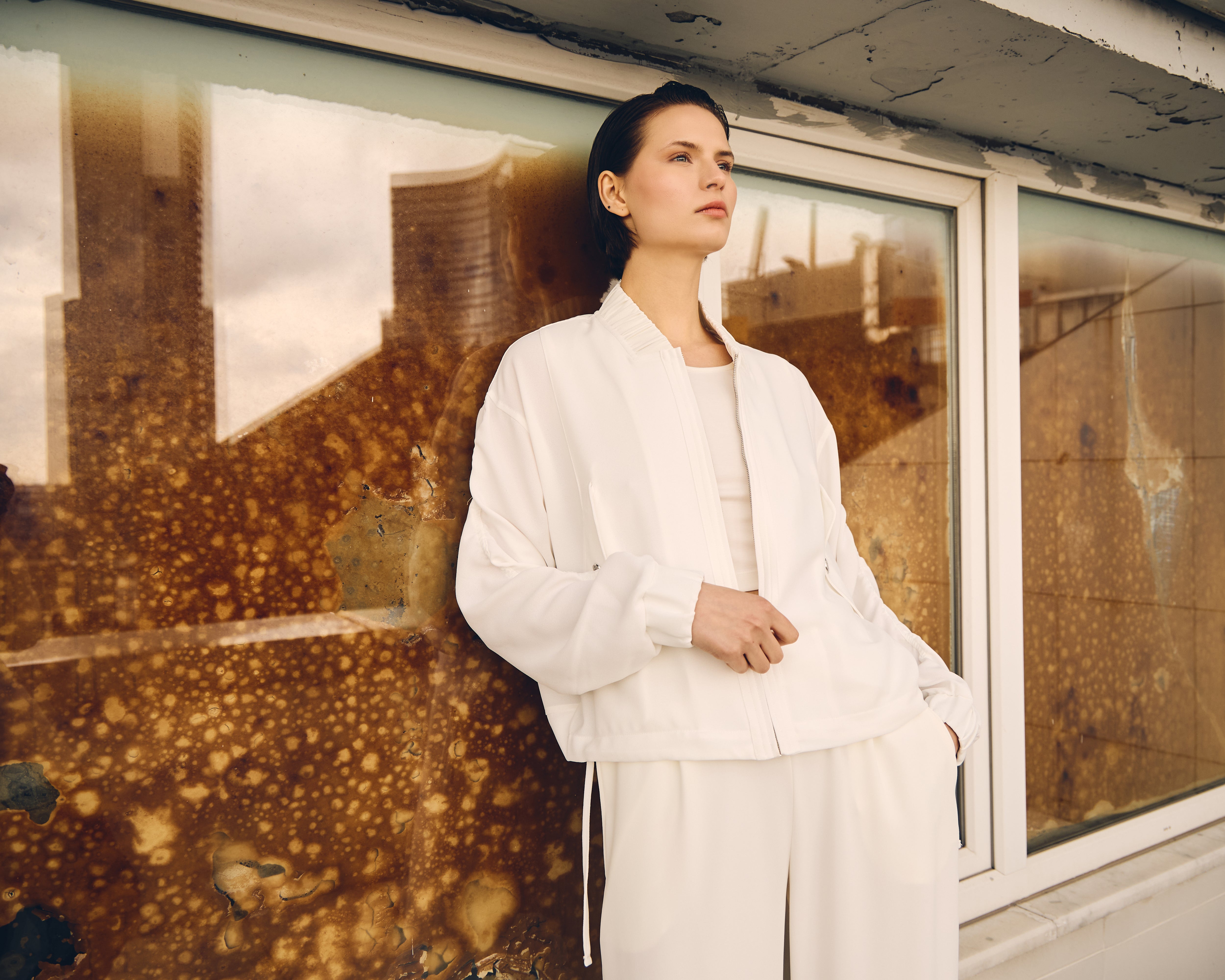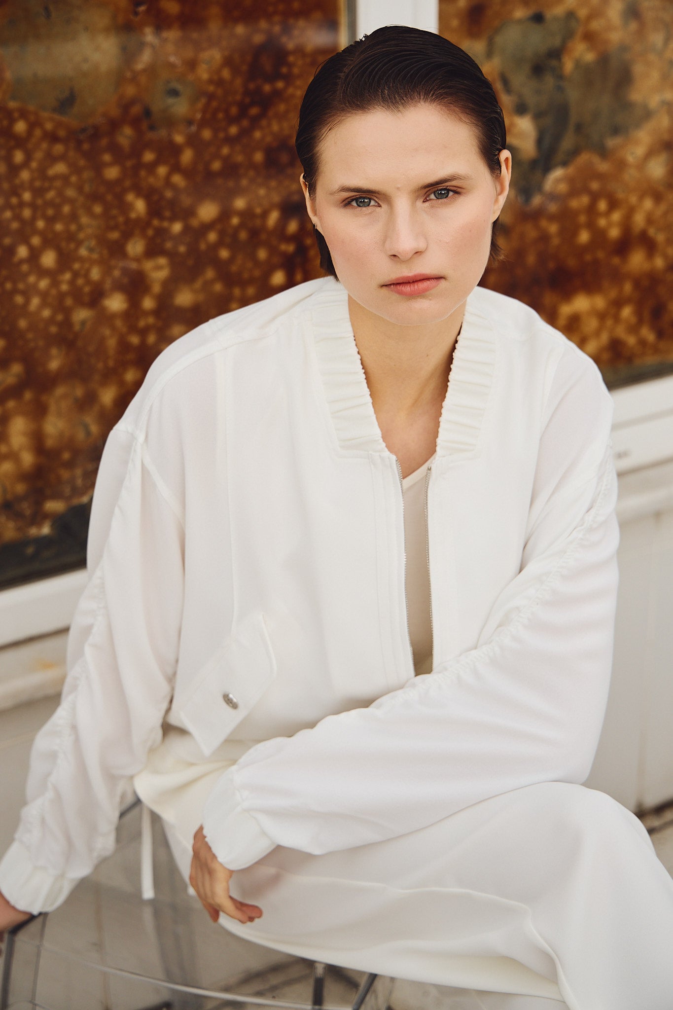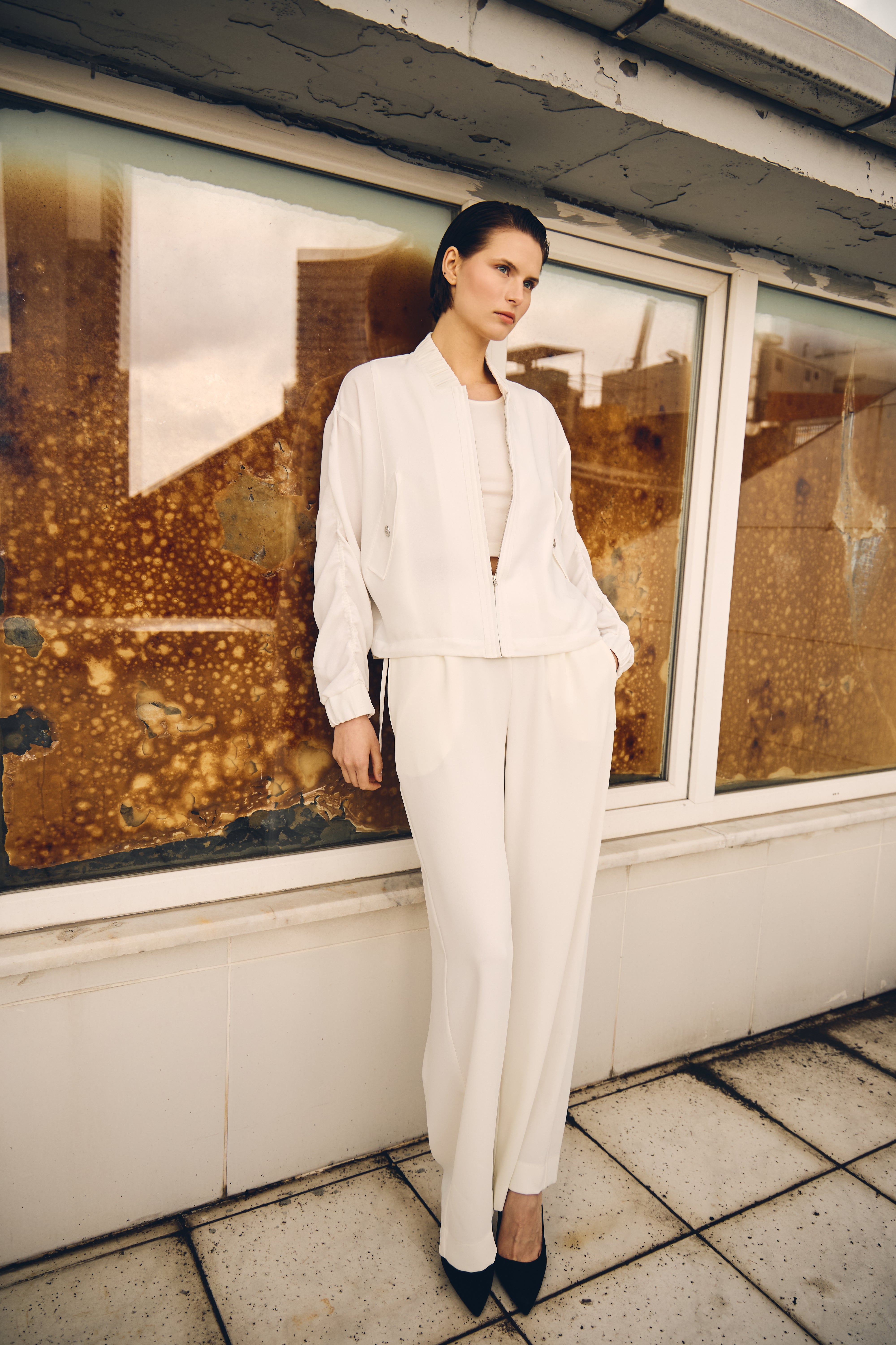Büzgülü Kol Fermuarlı Bomber Ceket (Beyaz)