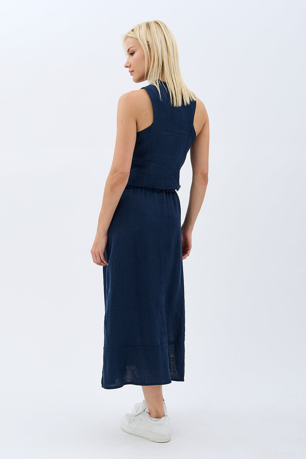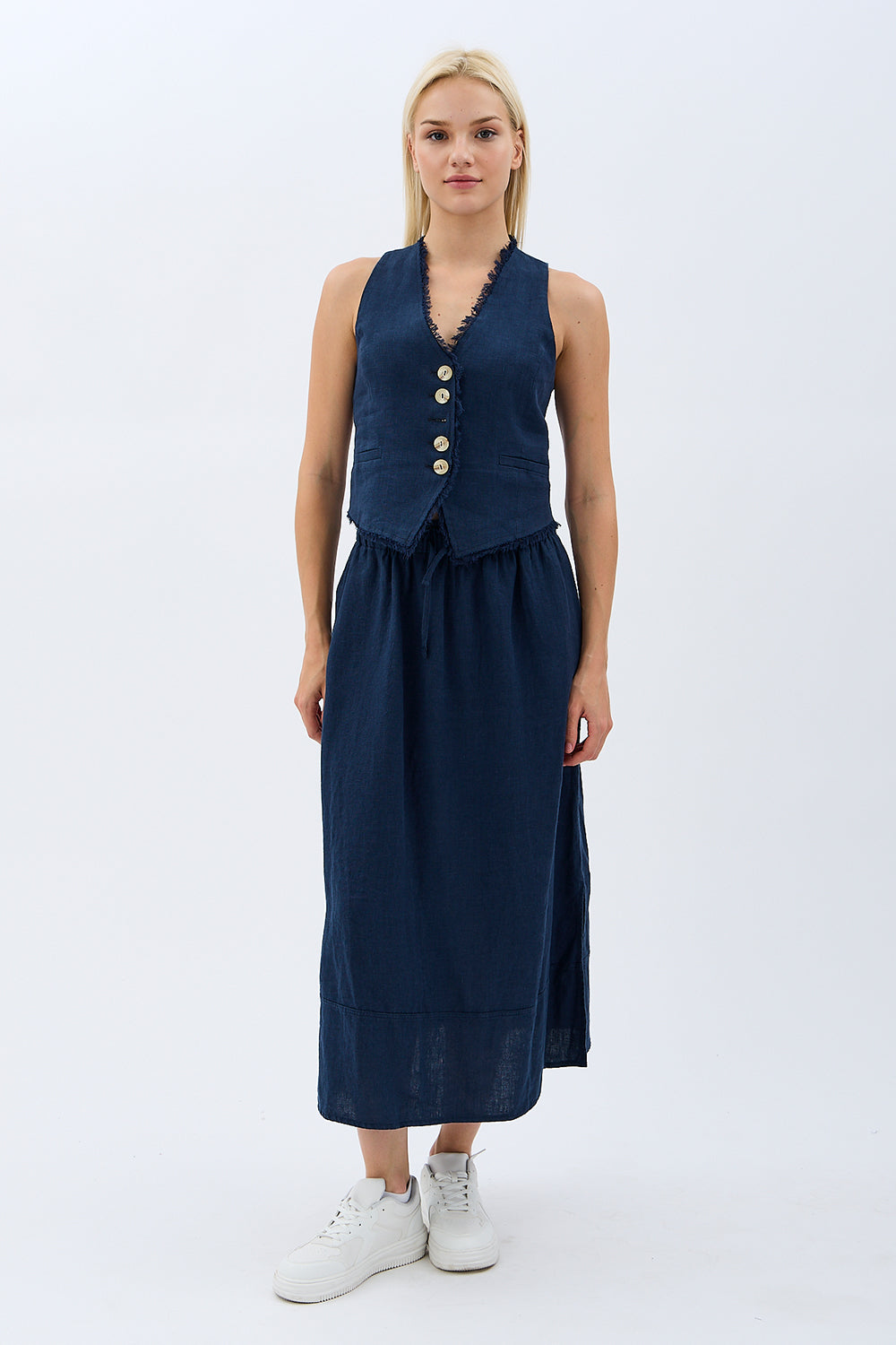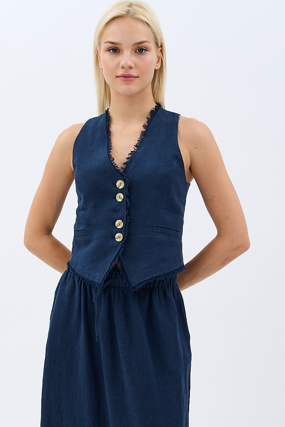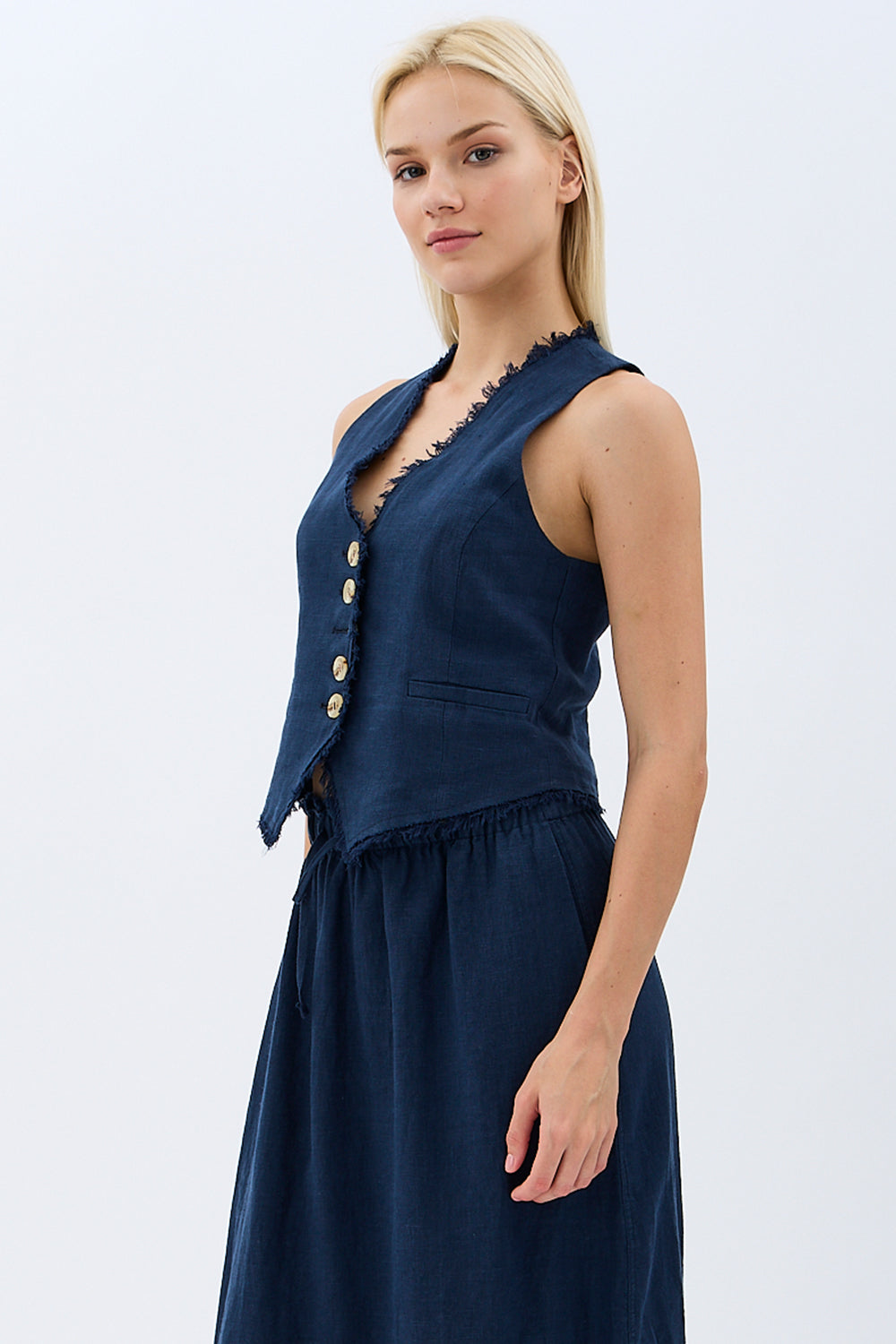 Tasarım Düğmeli Keten Yelek (Lacivert)