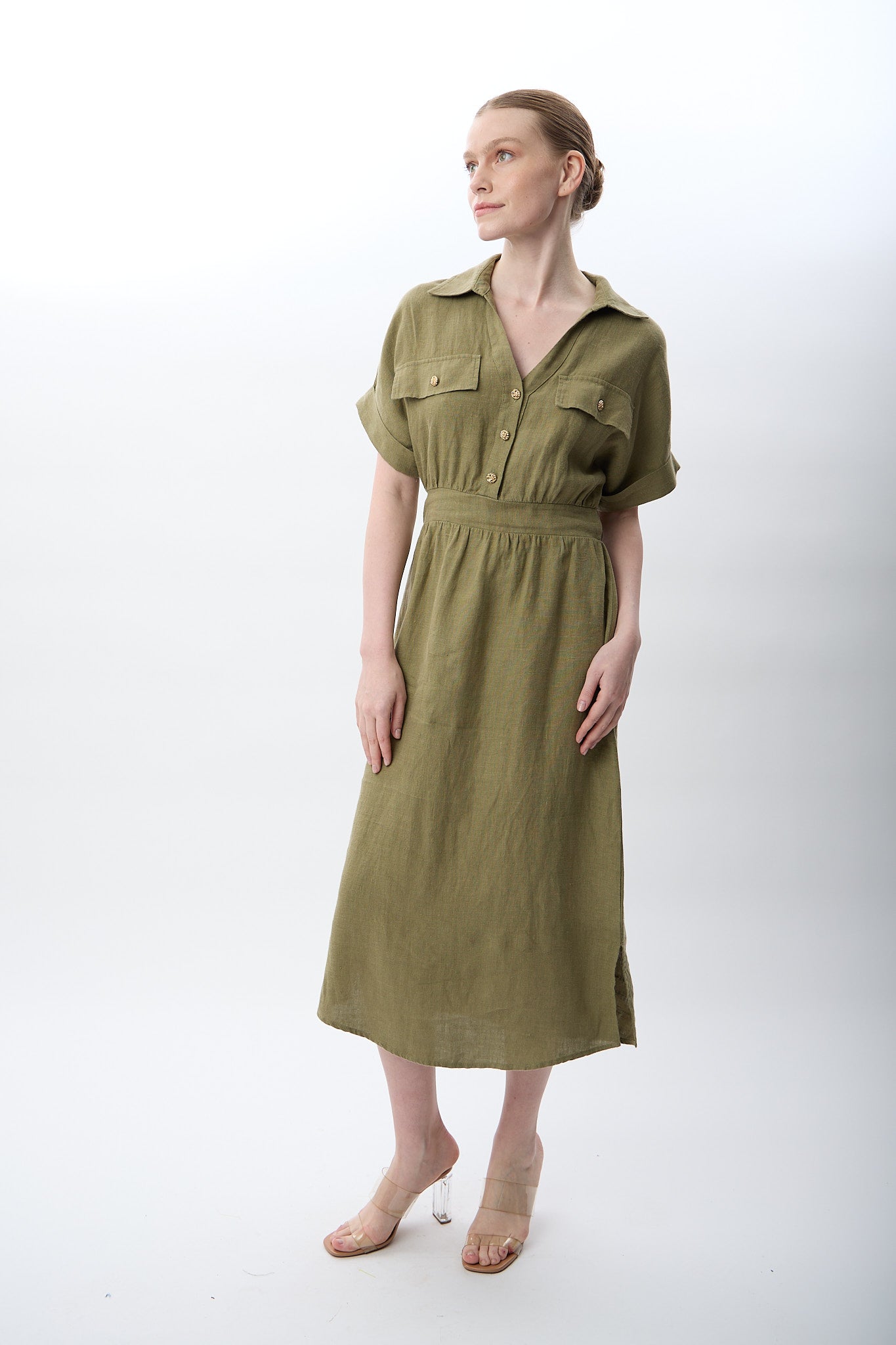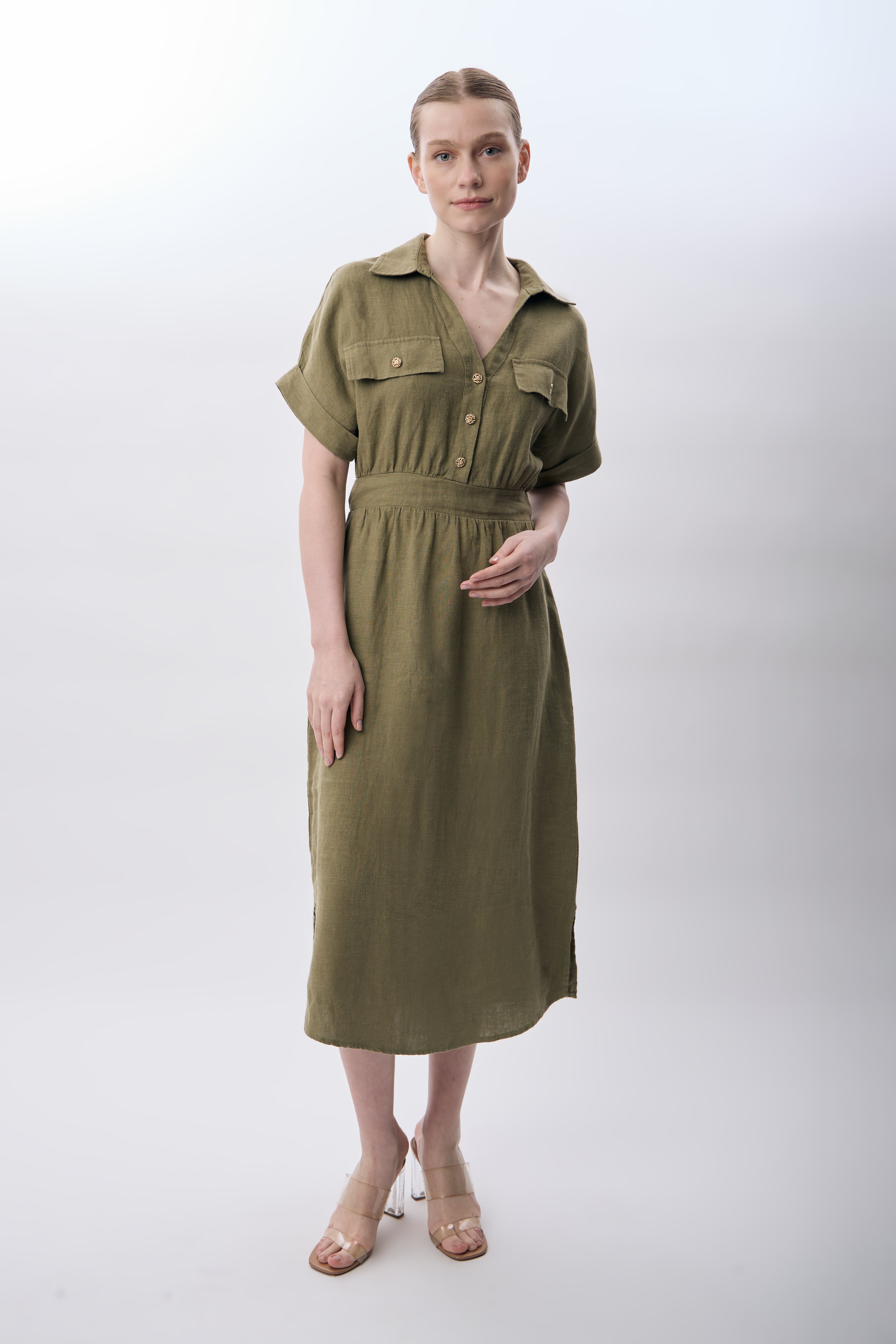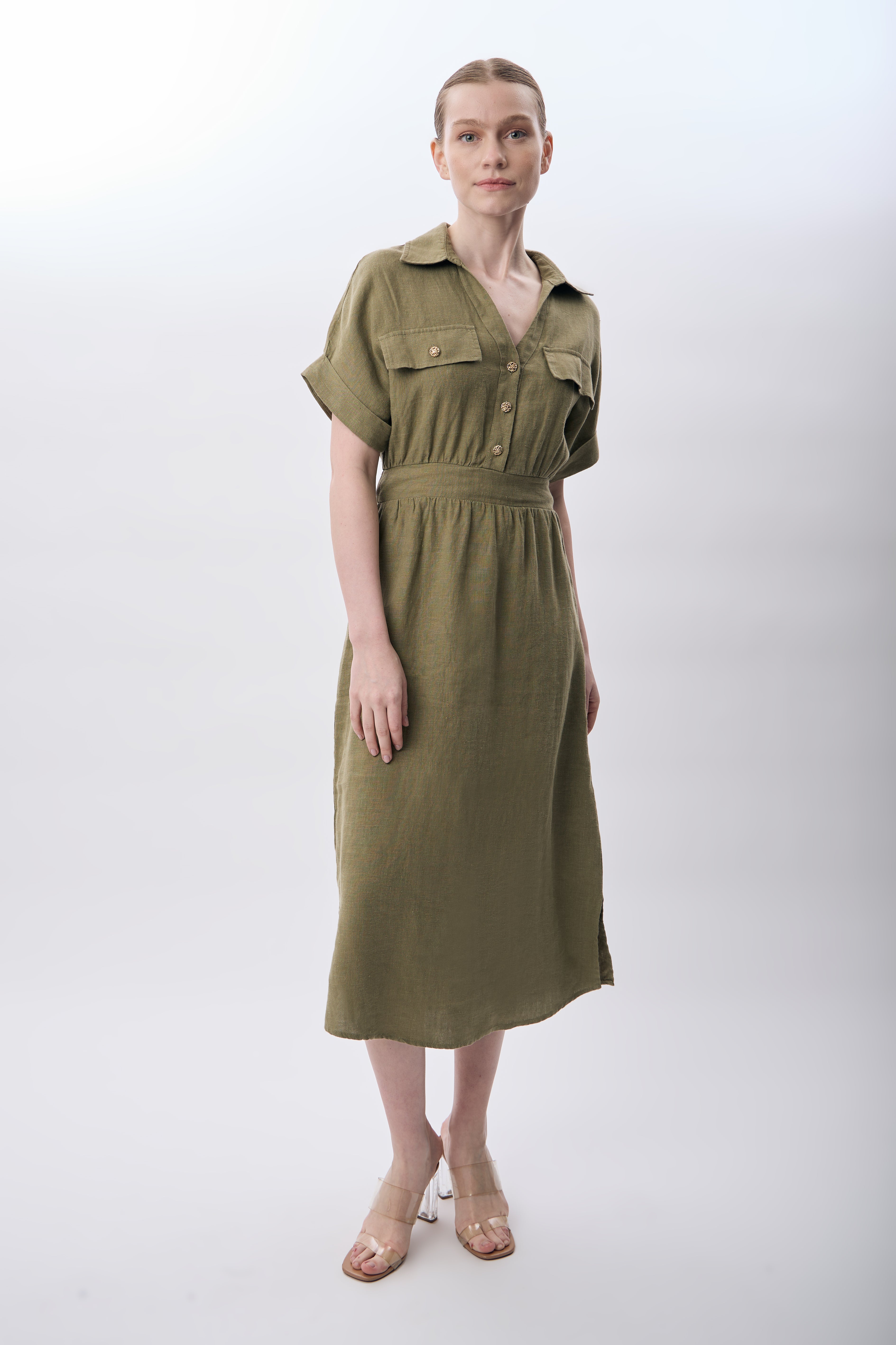 Gömlek Yaka Cepli Elbise (Haki)