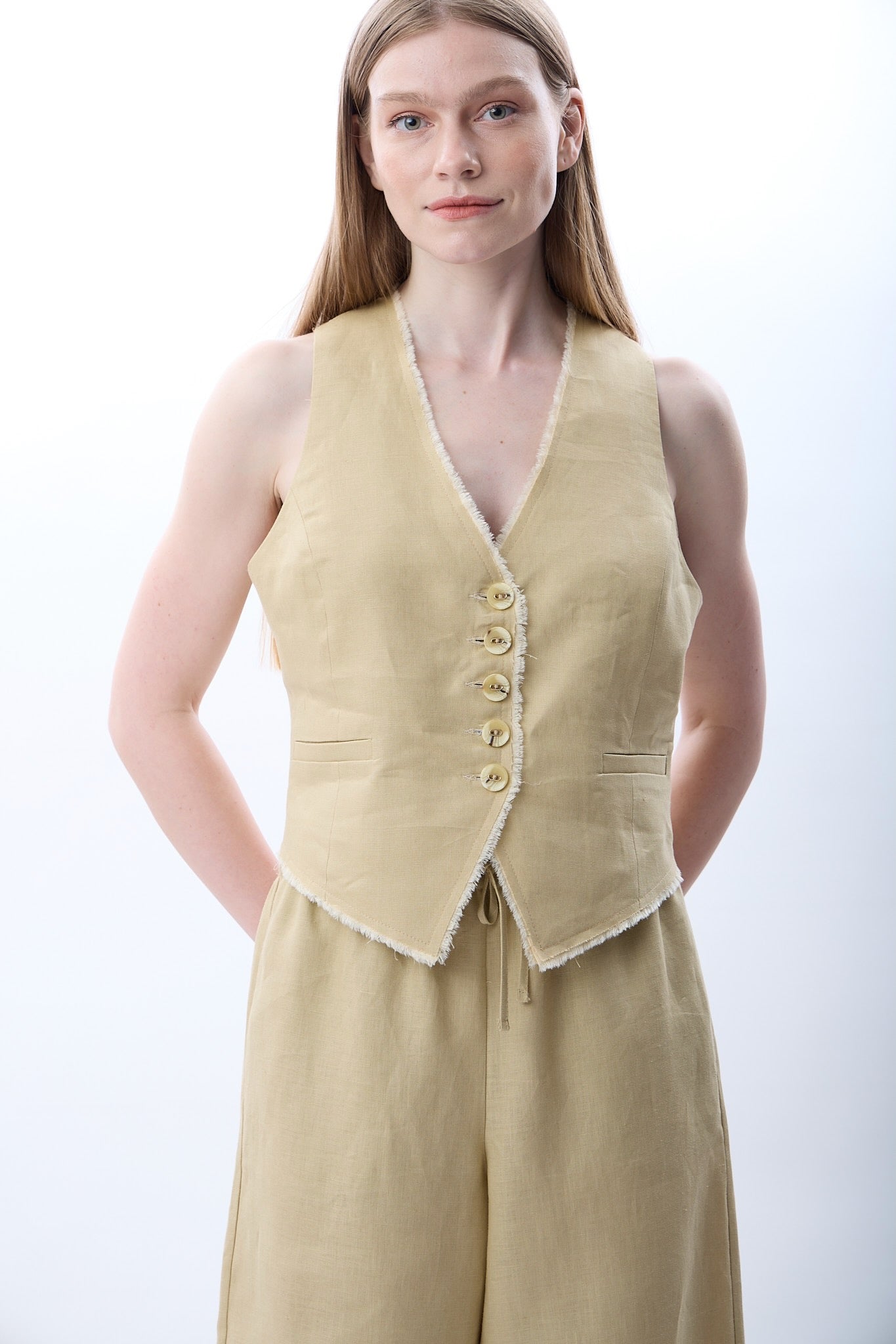 Düğmeli Keten Kolsuz Yelek (Bej)