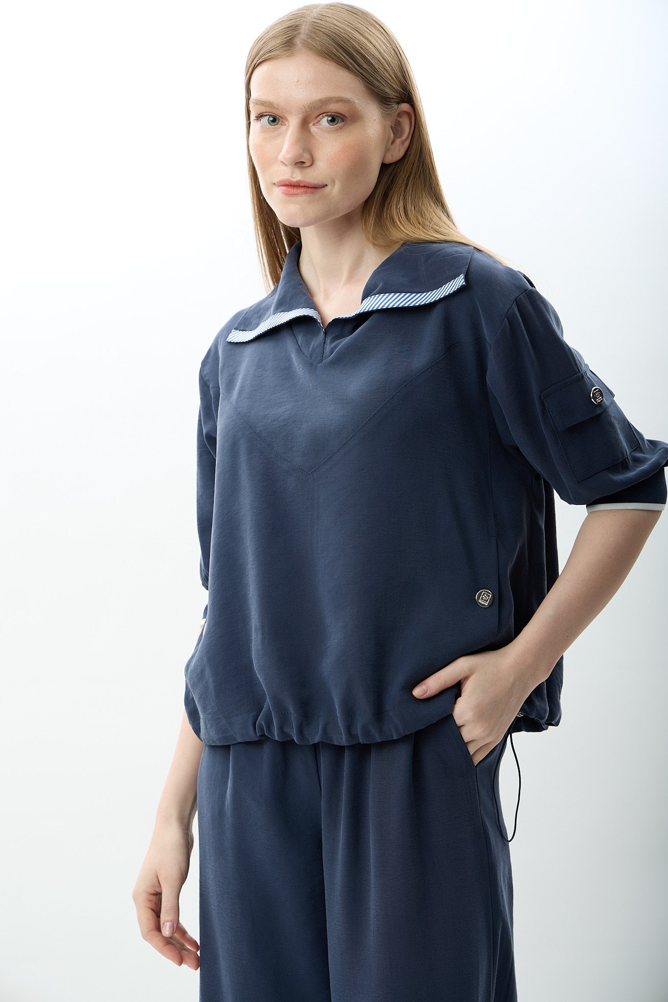 V Yaka Büzgü Detaylı Bluz (Lacivert)