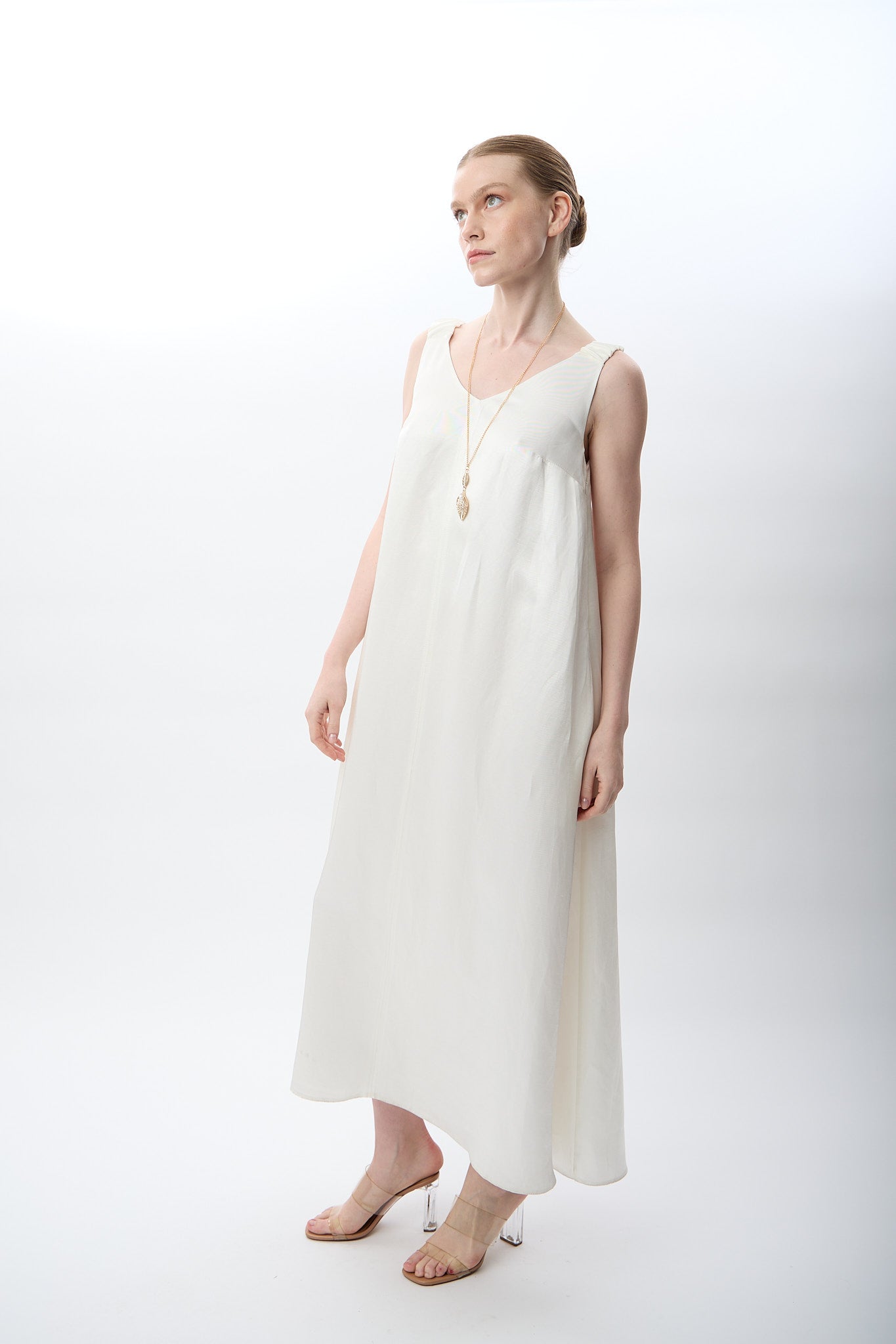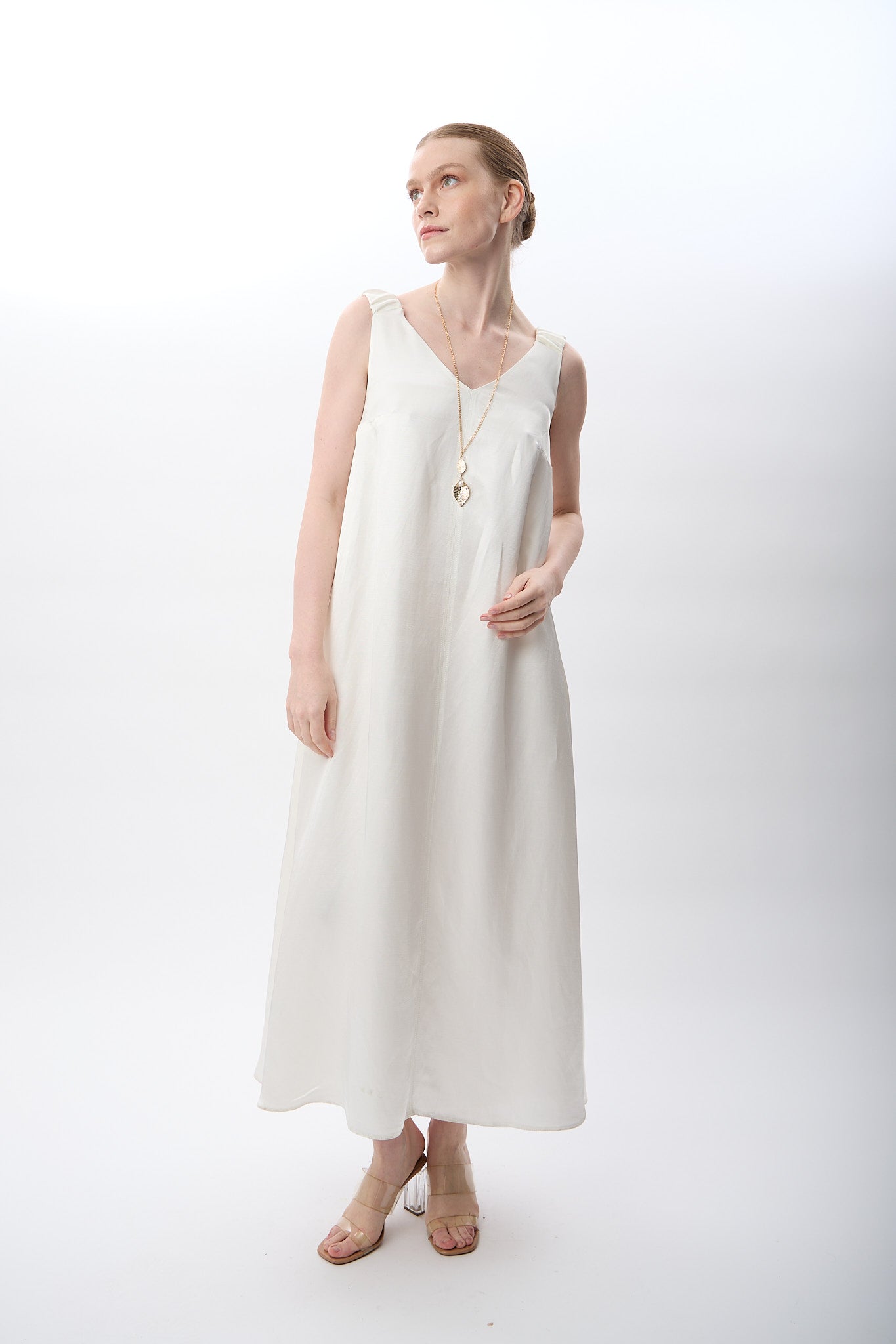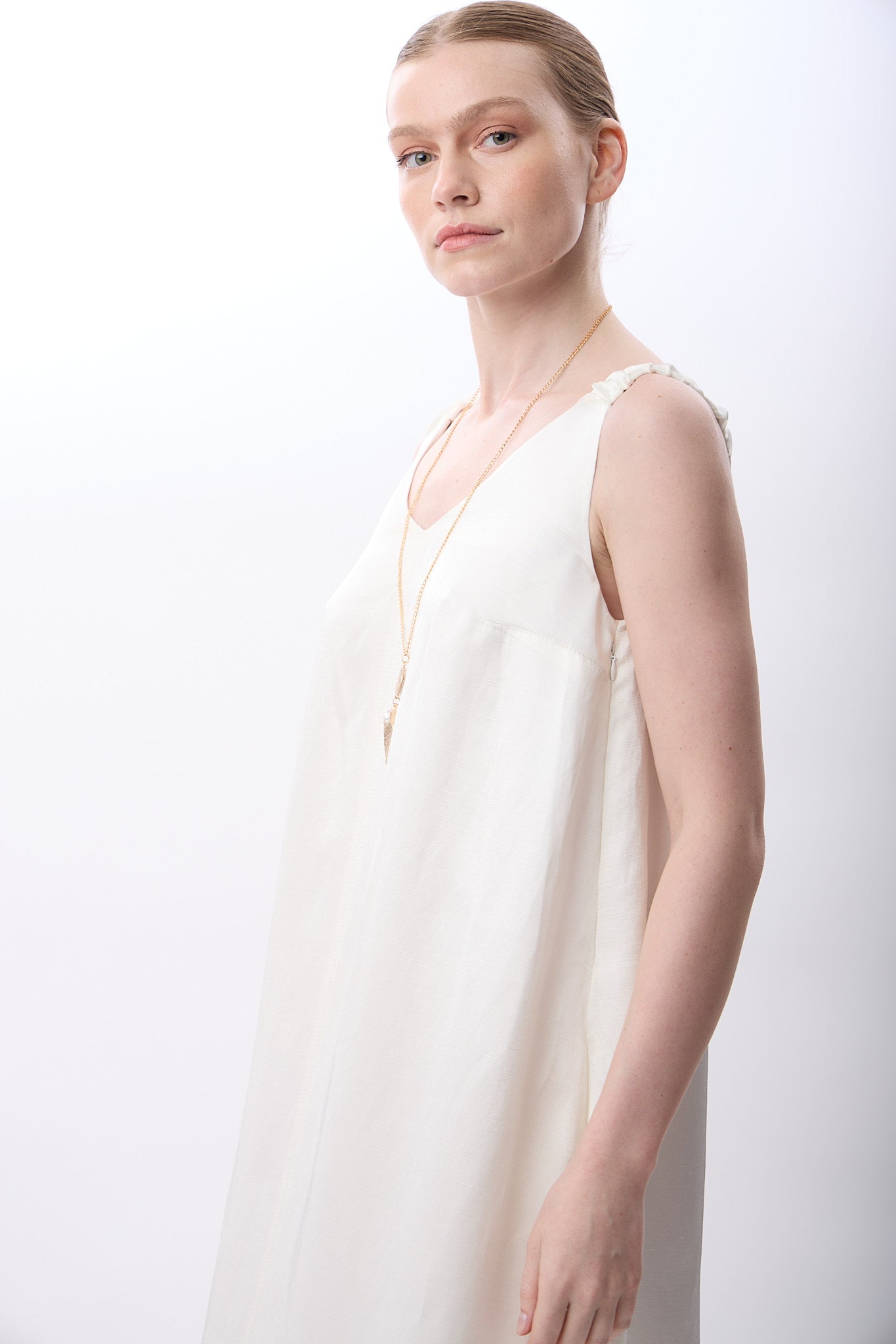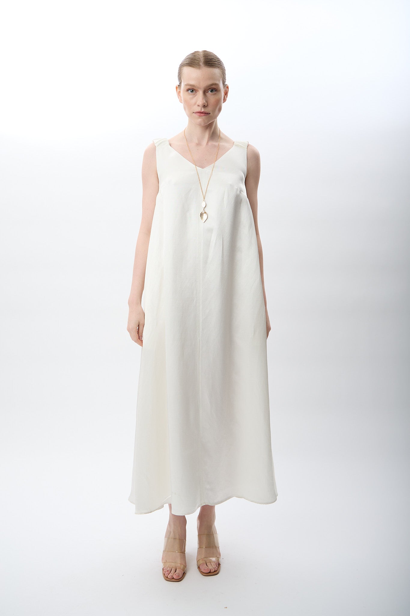 V Yaka Kolsuz Uzun Elbise (Ekru)