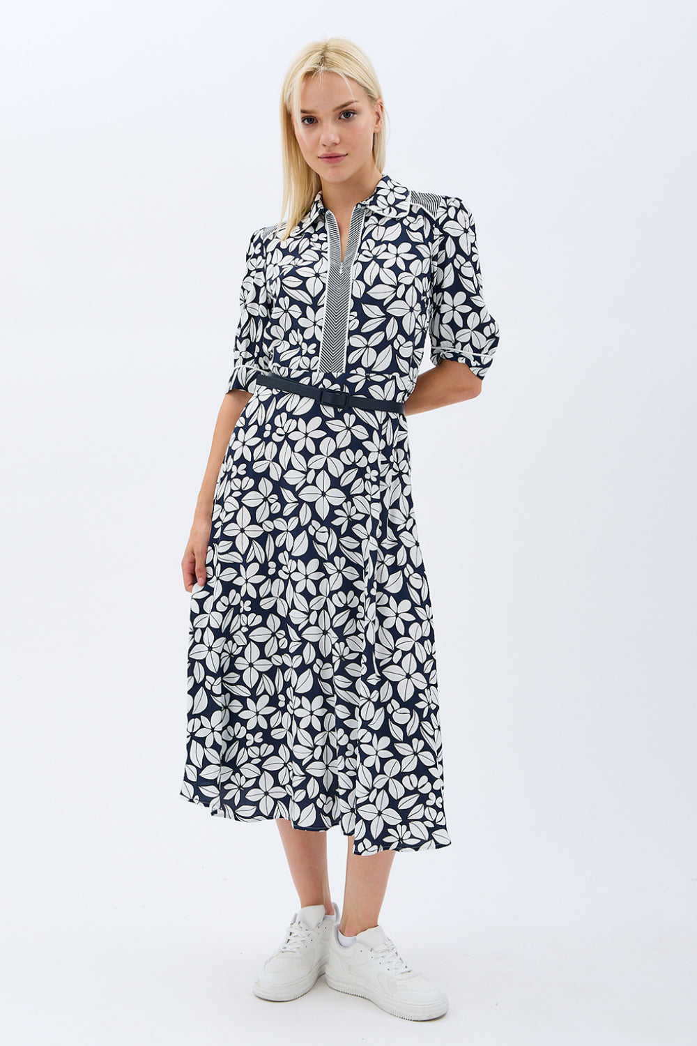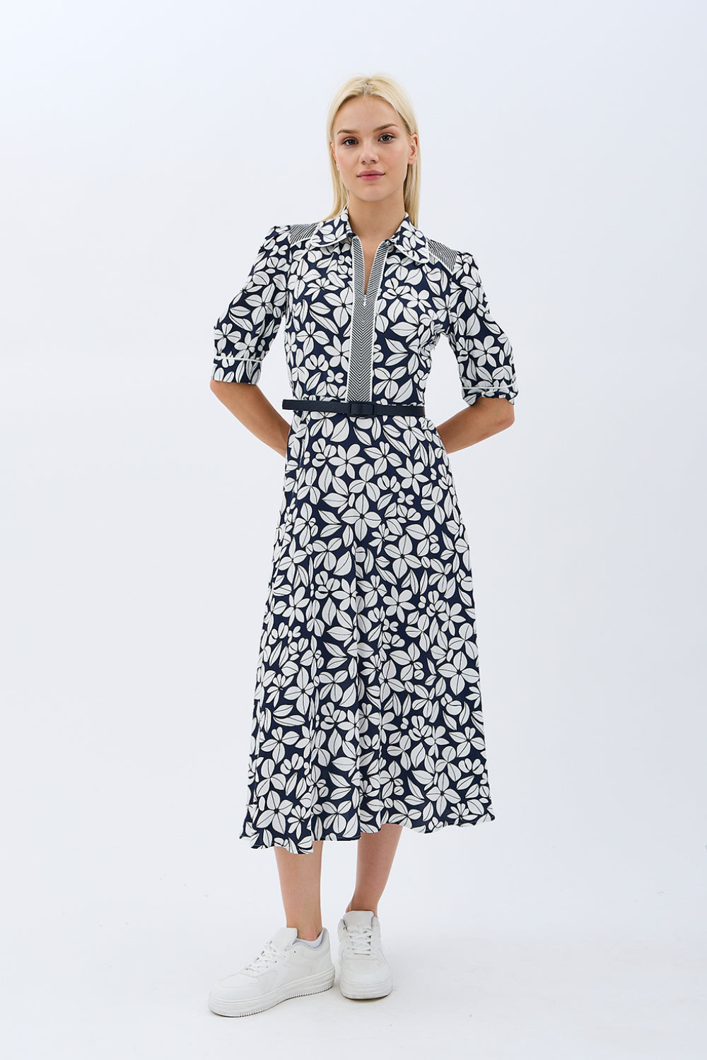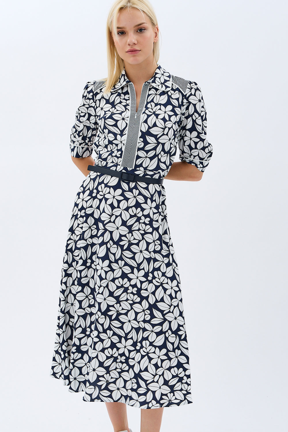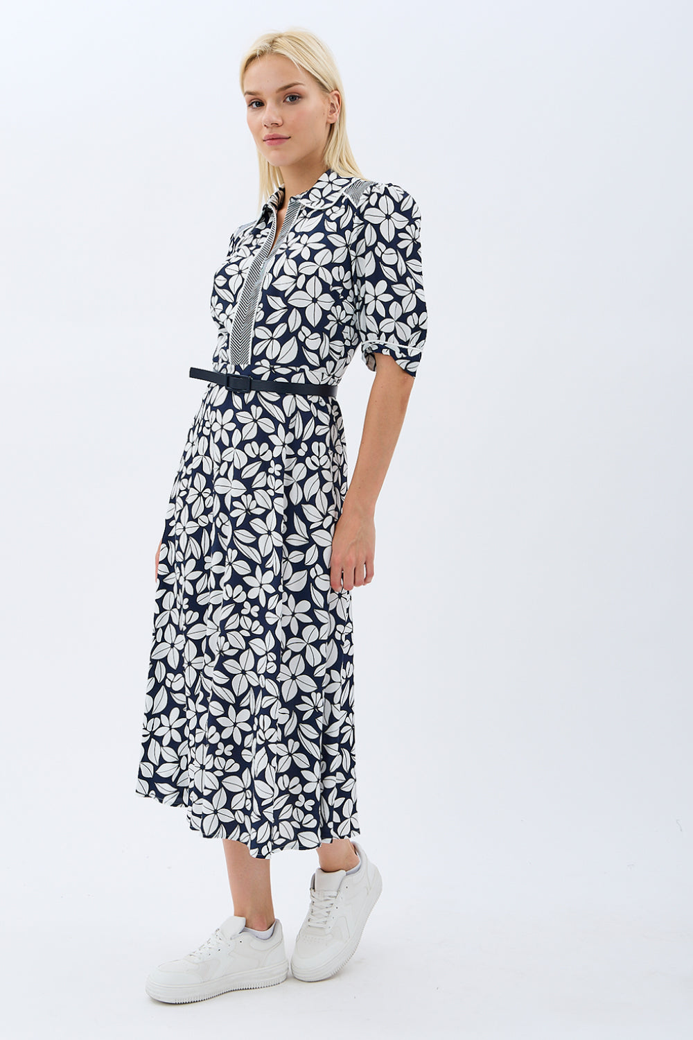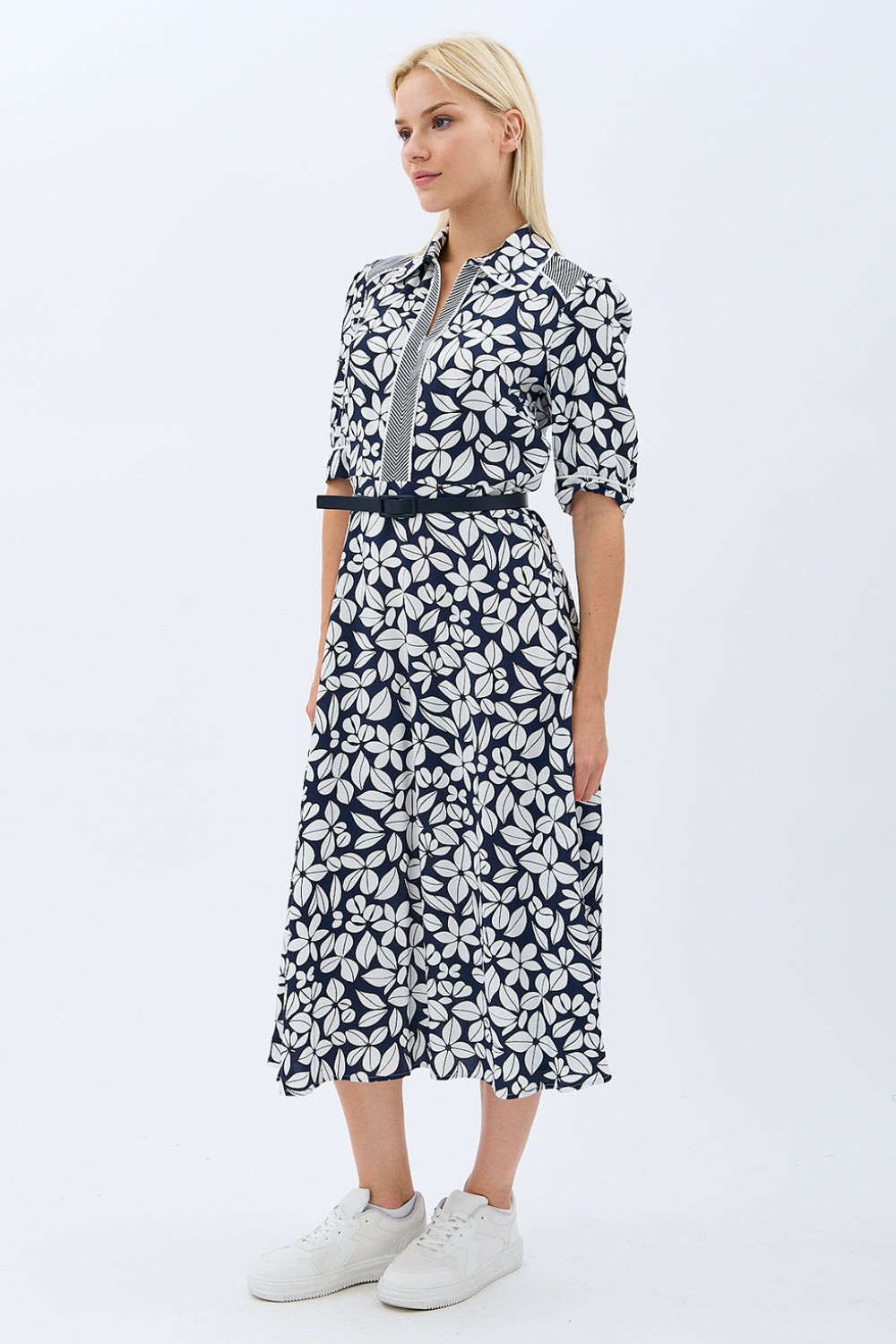 Yaprak Desenli Kemerli Gömlek Elbise (Siyah)