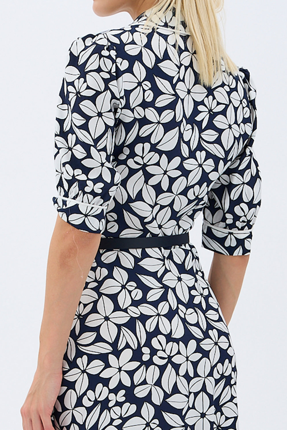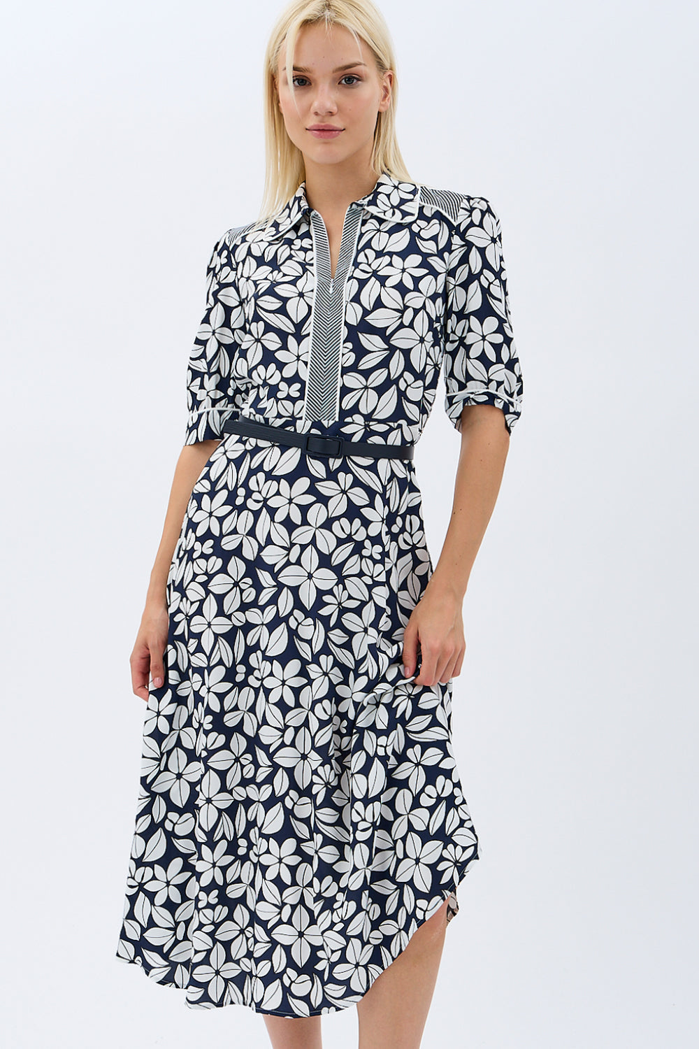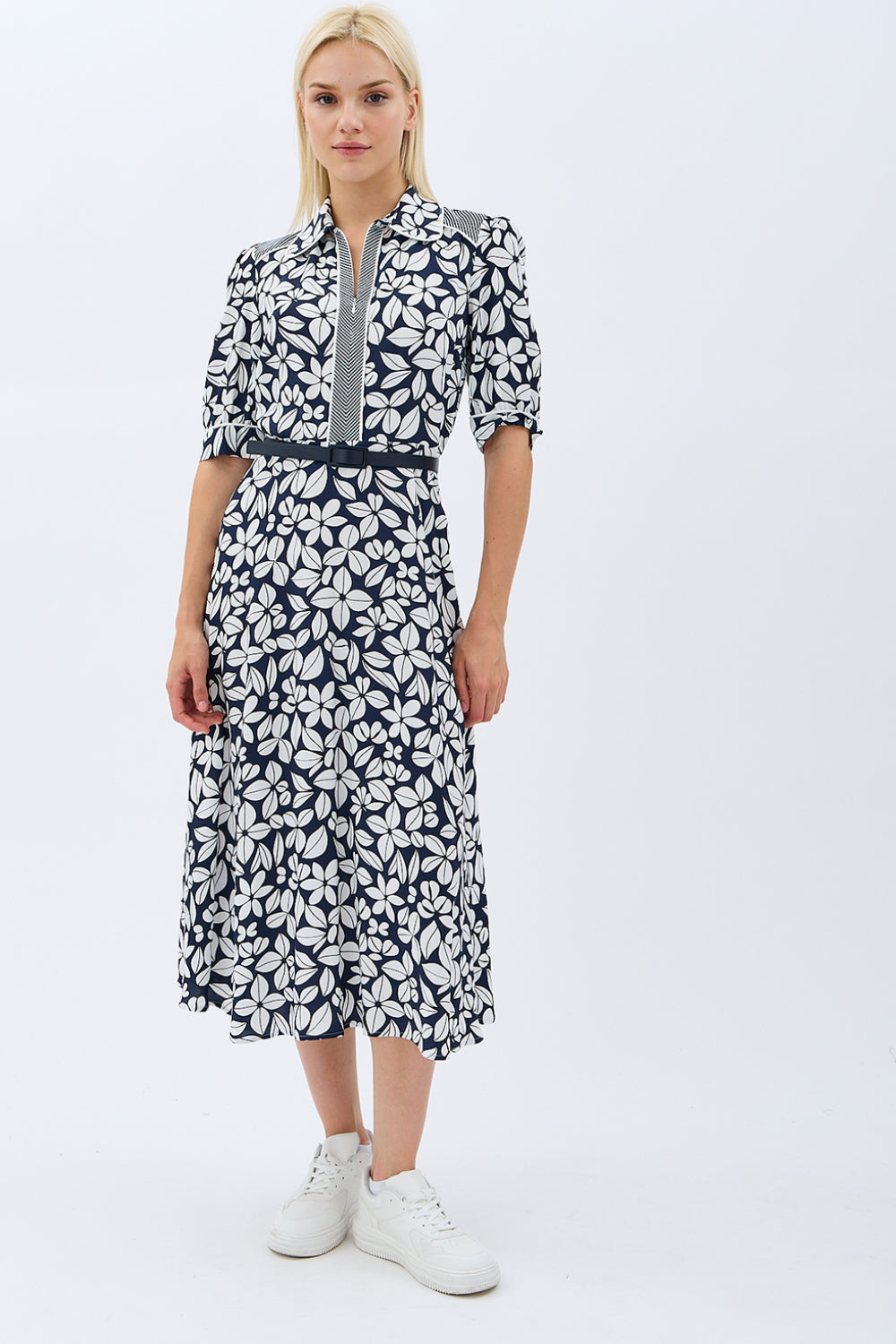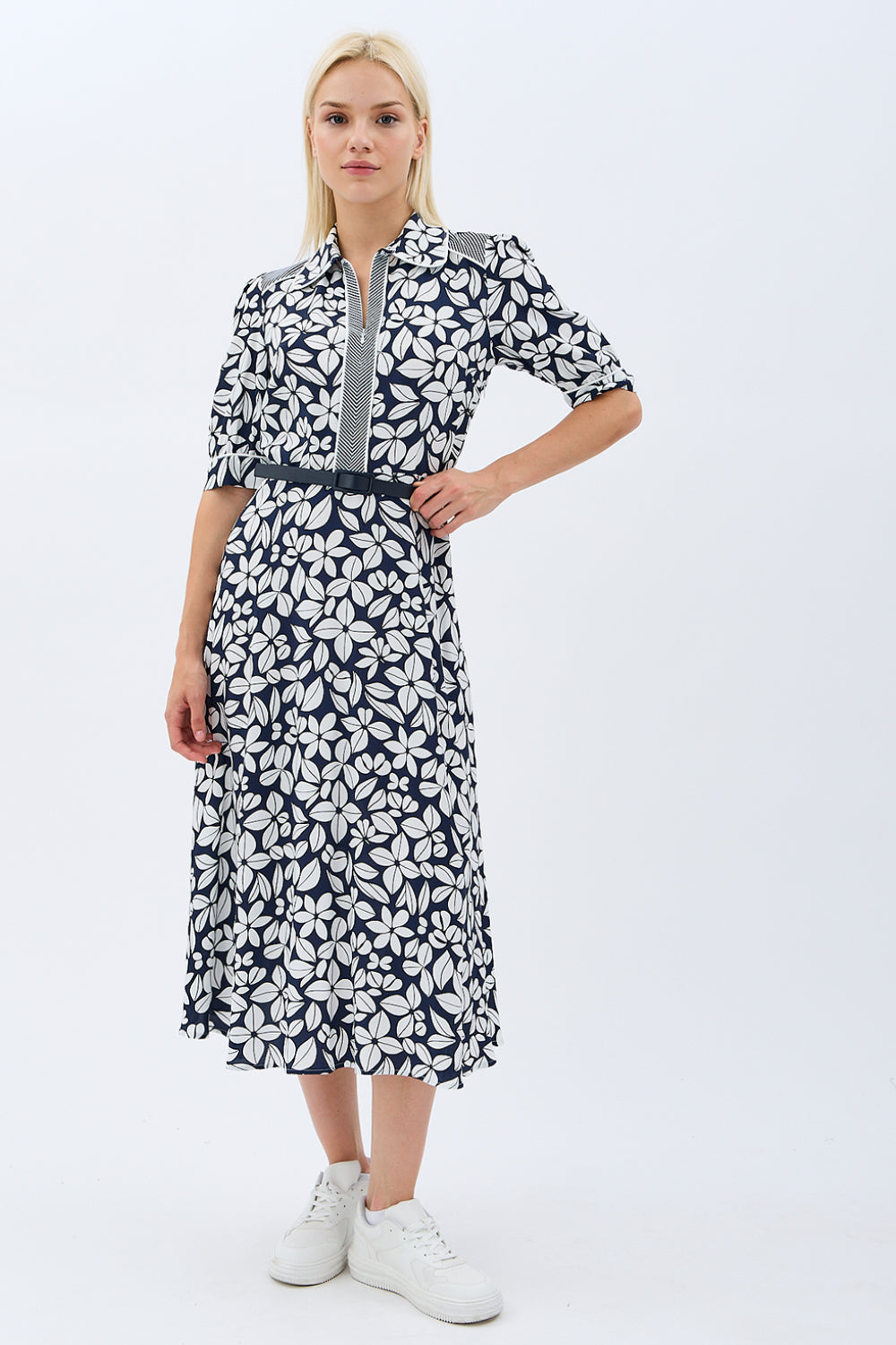 Yaprak Desenli Kemerli Gömlek Elbise (Siyah)