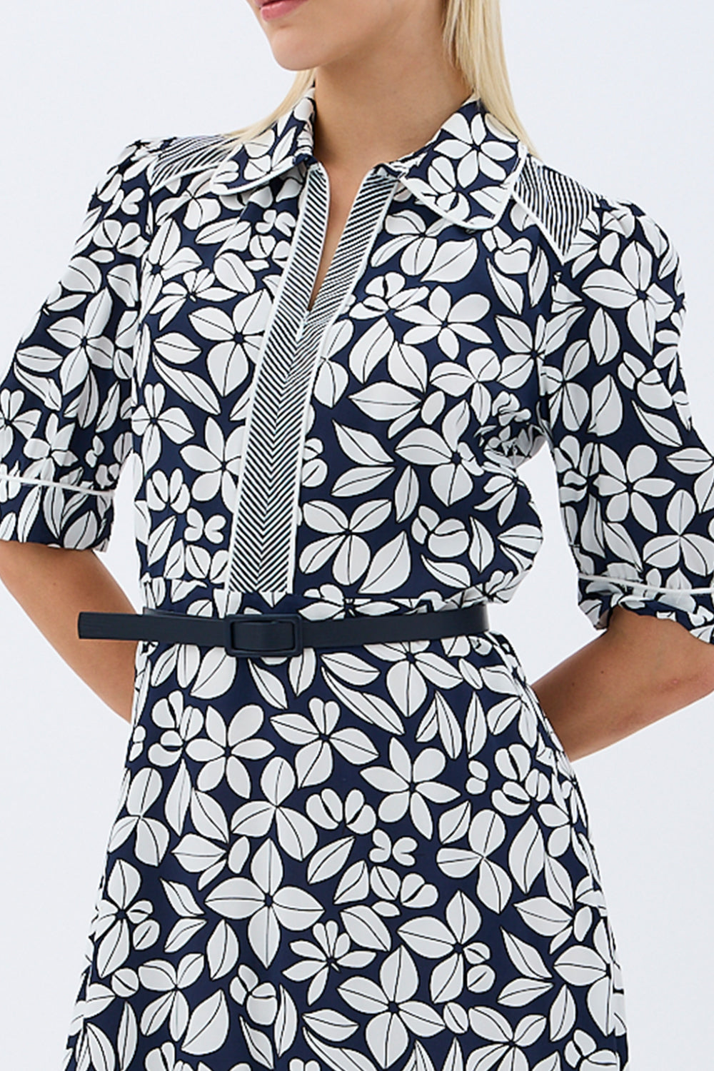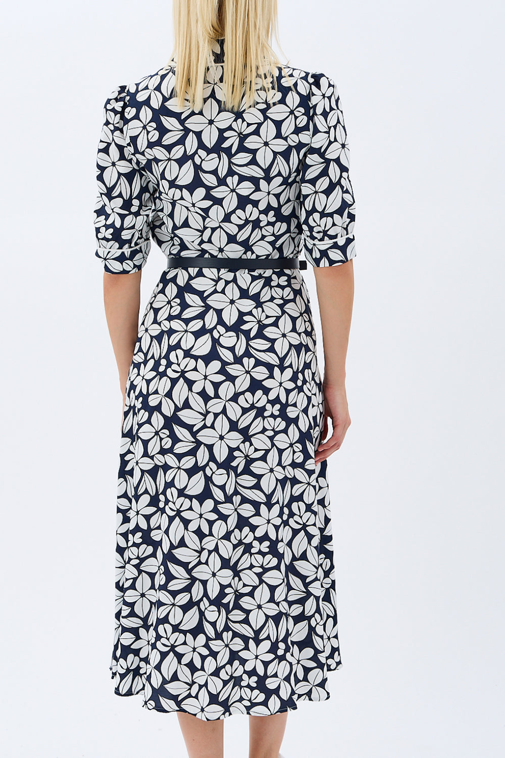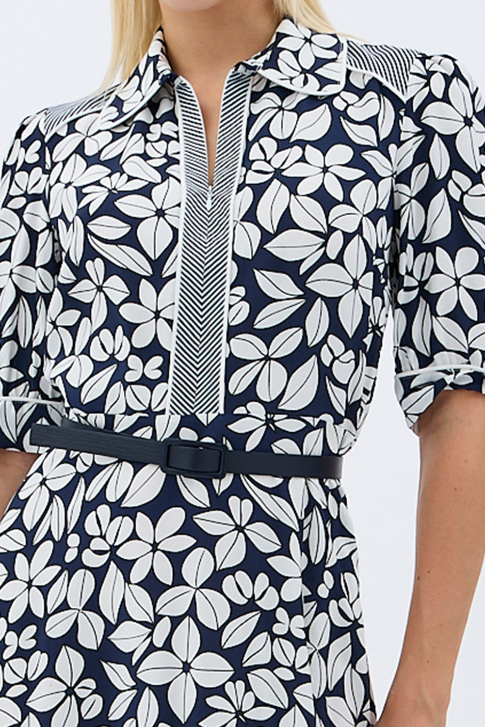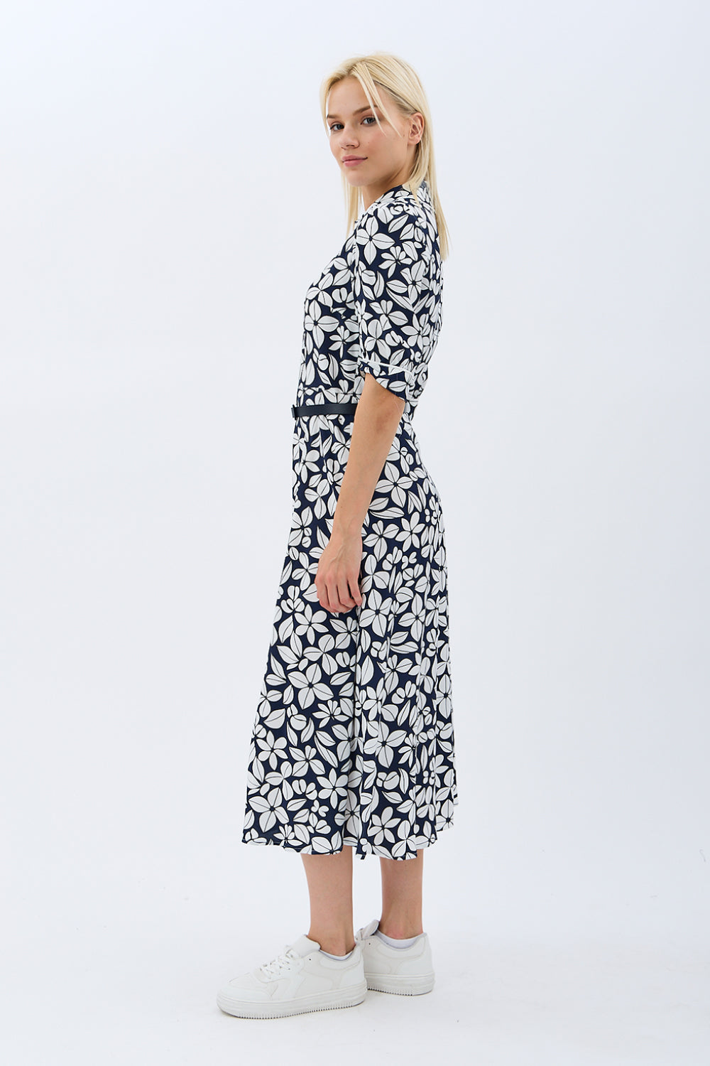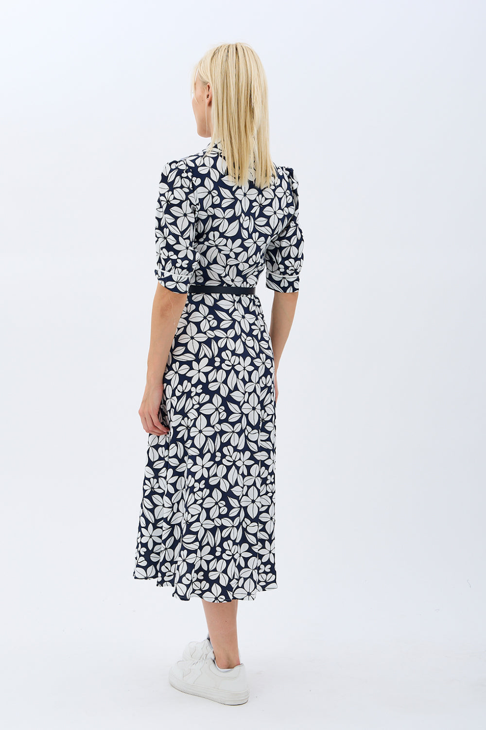 Yaprak Desenli Kemerli Gömlek Elbise (Siyah)