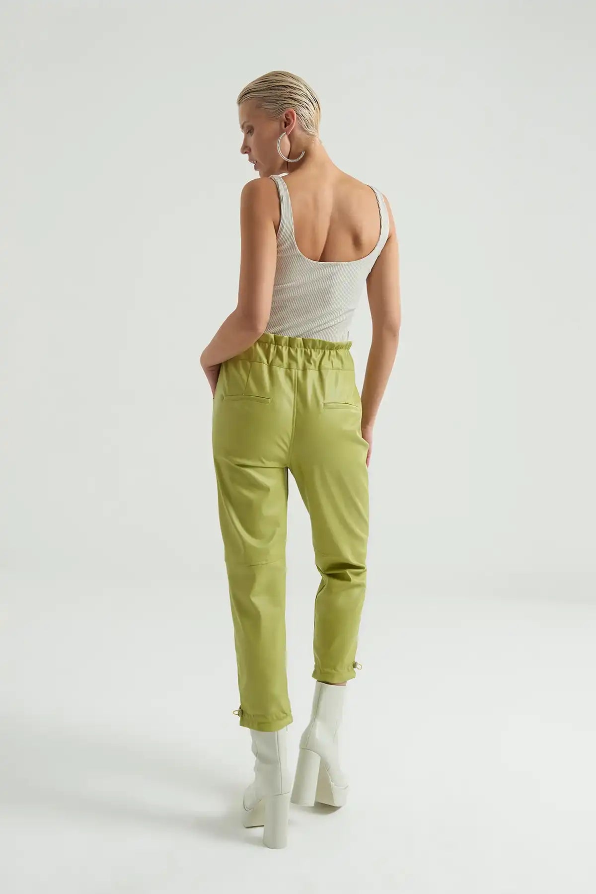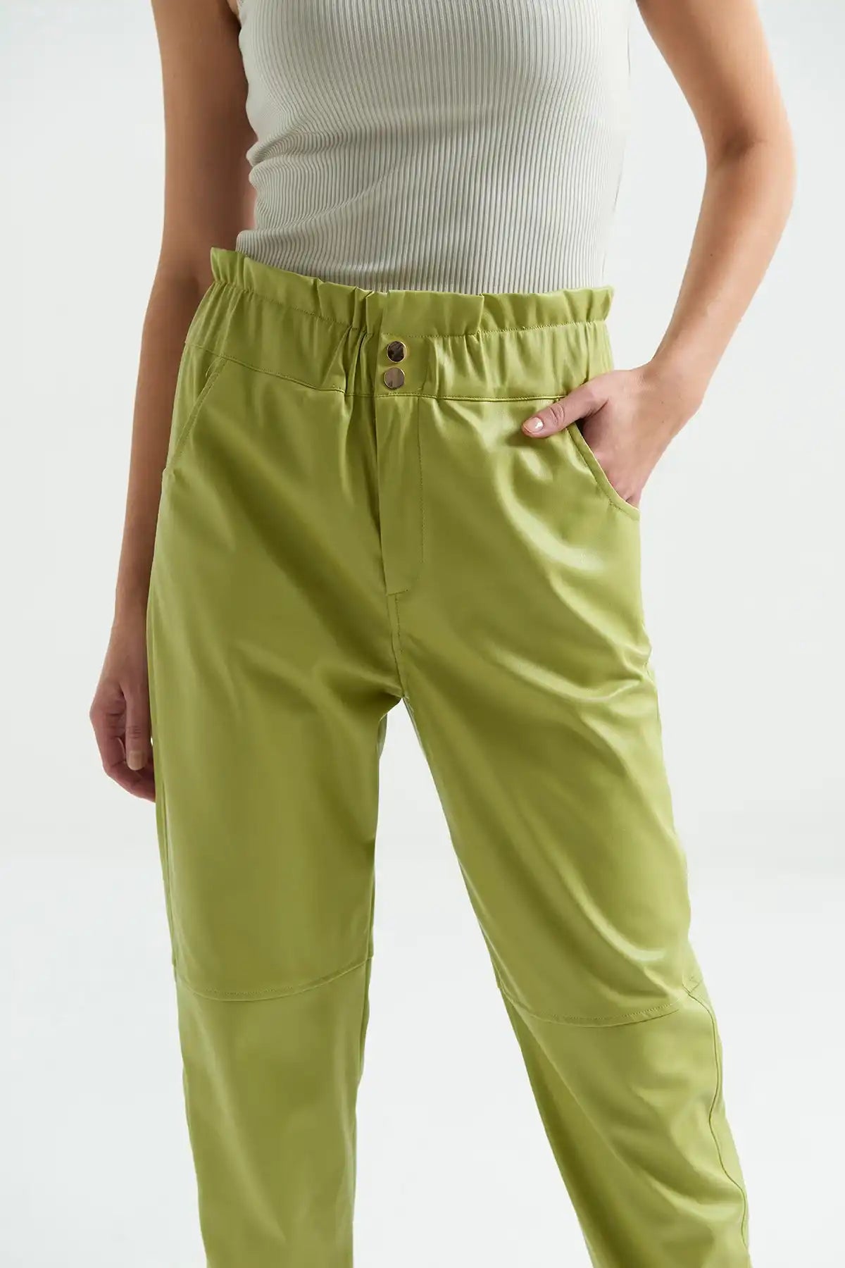 Beli Lastikli Büzgülü Deri Pantolon